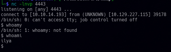 ahora, ganando la revershell de nuevo, y ejecutando este comando, podemos conectarnos como ilya sin contraseña: