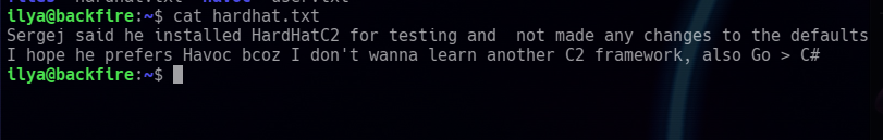 Sergej dice que ha instalado HardHatC2 para probar y que no ha echo ningún cambio de los defaults, espero que el prefiera havoc porque no quiero aprender otro framework de c2, tambien Go > C#