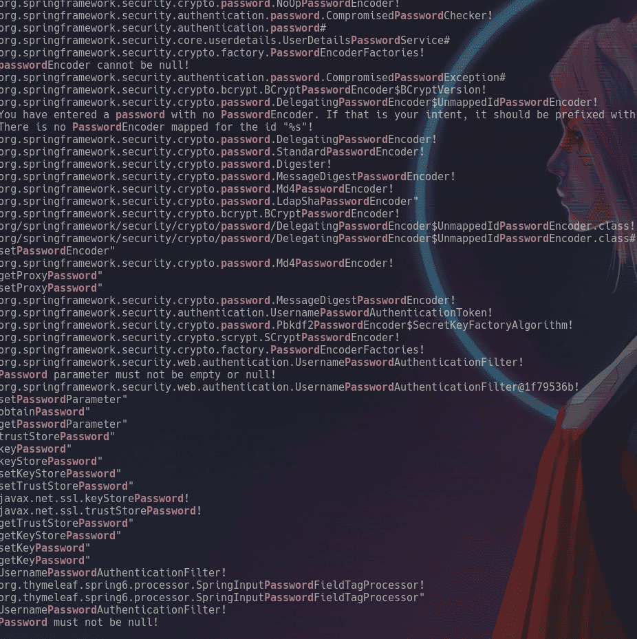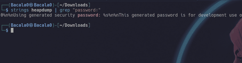 despues de buscar por mucho con el programa visualVM que es una interface grafica para ver volcaldos de memoria como este no encontre nada, intentando usar filtros y abriendolo, no tenia resultados al estar en hexdump, pero, convirtiendolo con strings y filtrando con grep la palabra “password” ya podia ver un poco mejor el contenido:
