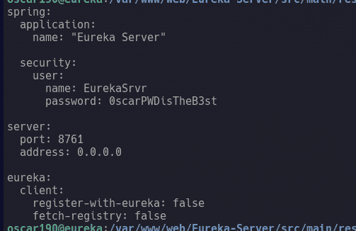 user: EurekaSrvr password: 0scarPWDisTheB3st