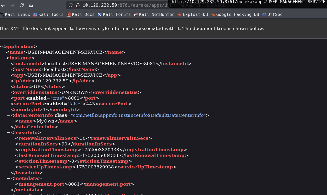 probando las credenciales en la pagina del puerto 8761 no tenemos resultados, pero por ssh: