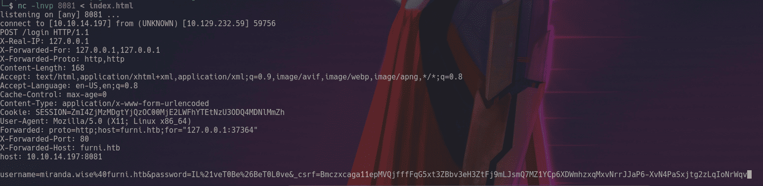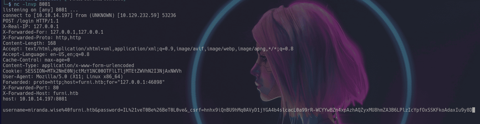 ffuf -w -c /usr/share/seclists/Discovery/Web-Content/quickhits.txt -u http://furni.htb/FUZZ