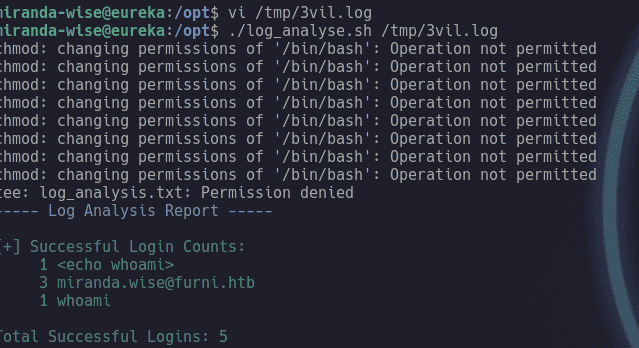 el error era que miranda ejecutaba el script, aunque hay una tarea programada, para que cada cierto tiempo fuera root quien ejecutara el script pero al ejecutarlo nosotros se hace como el usuario si hacemos un bucle que constantemente elimine el .log e inyecte el log malicioso, solo nos quedaria esperar a que sea root (o la tarea cron) el que ejecute el log_analyse.sh