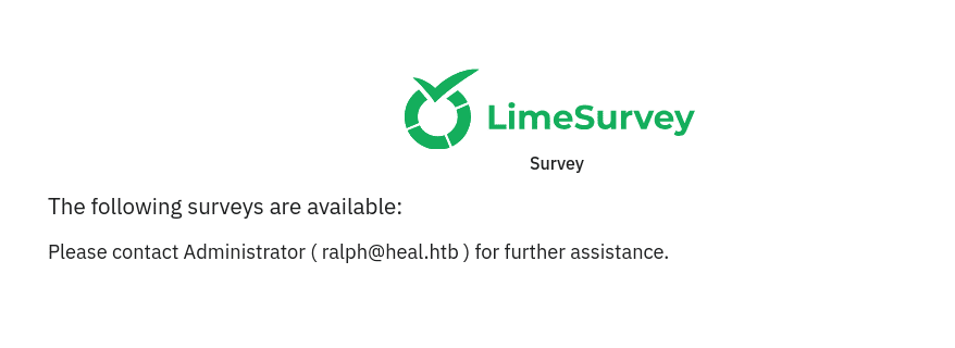 limesurvey, el cual expone el nombre de usuario de un administrador Ralph@heal.htp
