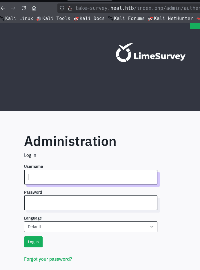 hola! vamos a P0wn3ar esta Heal, se trata de una aplicacion web la cual tiene 2 subdominios, en el cual uno de ellos hay una mala configuración que puede ser aprovechada para explotar la vulnerabilidad LFI, lo que nos hará encontrar archivos de configuracion importantes en el servidor y datos mal almacenados que seran usados para iniciar en un panel administrativo y explotar la subida de Pluggins maliciosos en limesurvey pudiendo ganar una reverse shell en el sistema objetivo. En la escalada de privilegios tenemos algo similar, llegando a una aplicación de la red interna mediante ssh-portfordwarding e inyectando un servicio malicioso en la misma.