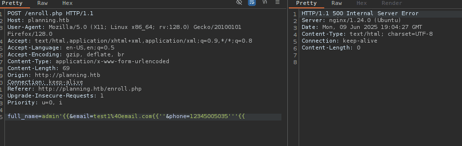 probando causar errores, malformaciones y respuestas extrañas del servidor con el formulario enroll.php, he conseguido que el servidor la procese mal agregando { en la parte del numero de teléfono: