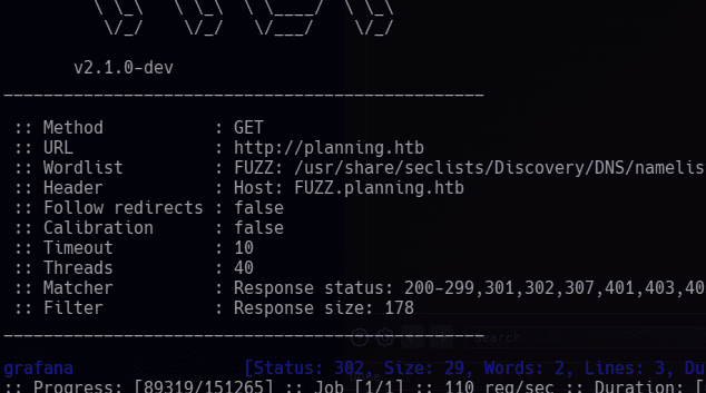 ffuf -c --fs=178 -w /usr/share/seclists/Discovery/DNS/namelist.txt -u http://planning.htb -H "Host: FUZZ.planning.htb"