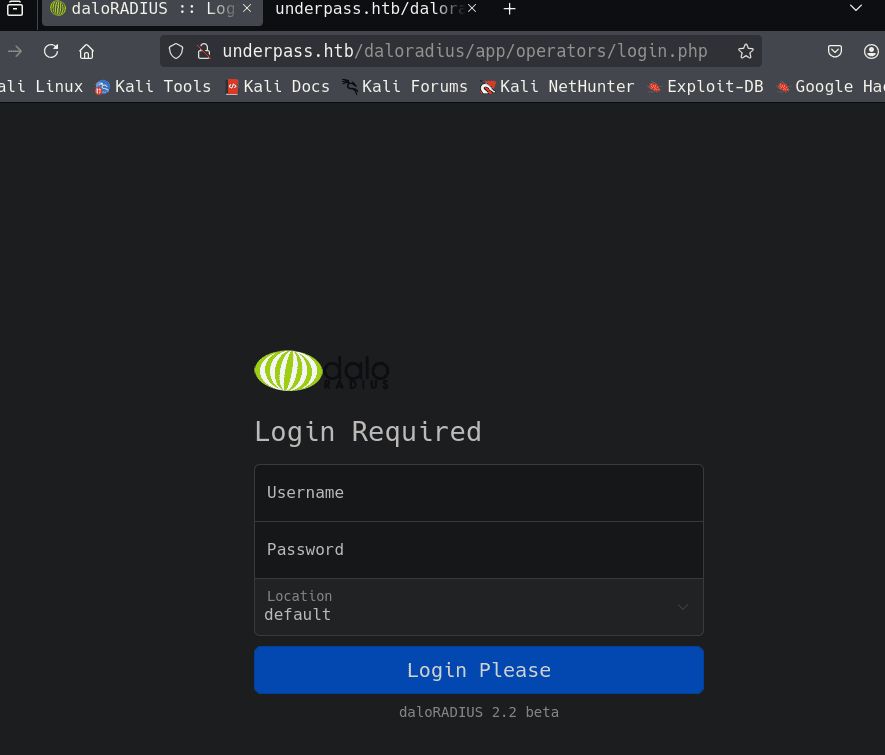 200 GET 15l 70w 5742c http://underpass.htb/daloradius/app/users/static/images/favicon/favicon-32x32.png